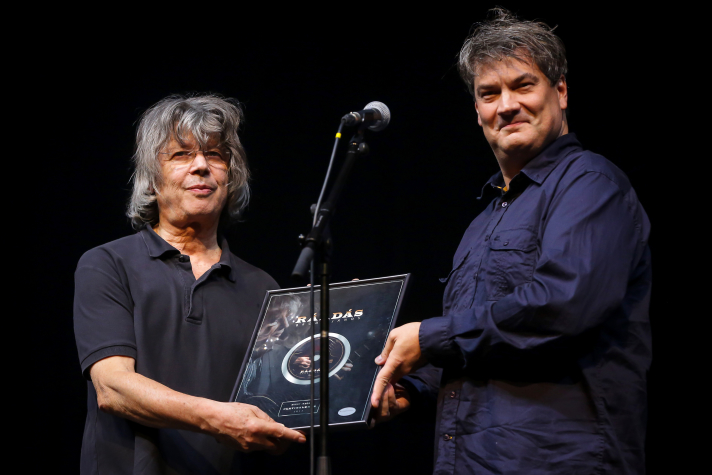 Fantasztikus hangulatú koncertek voltak az októberi forradalom adventjén a Budapest Kongresszusi Központban. Bródy János és Társulata itt vehette át a Grundrecords képviselőjétől a rekordszámban elfogyott lemezekért járó elismerést. (Platinalemez = 2 x Aranylemez) |